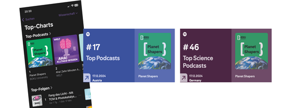 Seit Dezember 2024 ist die BOKU mit den „Planet Shapers“ auch auf der boomenden Online-Plattform Podcast vertreten. In kompakten 30 Minuten präsentieren unsere Forscher*innen und Start-ups jeden Monat aktuelle Themen, klimaschutzrelevante Projekte und bereits erfolgreich umgesetzte Lösungen – getreu dem Motto: Fakten. Forschung. Fertige Lösungen. Der fulminante Start spricht für sich: Platz 1 bei Apple Podcasts (Kategorie Wissenschaft), Platz 17 auf Spotify (gesamt) und sogar Platz 46 in den deutschen Top Science Podcast-Charts.