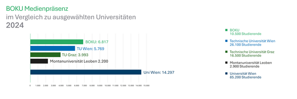 Dank der großartigen Zusammenarbeit mit Ihnen konnten wir 2024 einen beeindruckenden Erfolg in der Medienpräsenz feiern. Mit 6817 Presse-Clippings – von Print über Online bis hin zu Radio und TV – sichern wir uns erneut die Spitzenposition unter den technischen Universitäten Österreichs. Damit übertreffen wir die TU Wien, die TU Graz und die Montanuniversität. Die Uni Wien, Österreichs größte Universität, sehen Sie in der Grafik als Referenzwert.