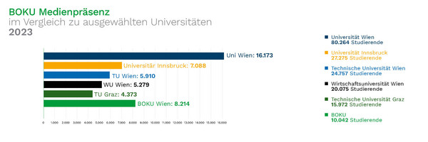 Der Erfolg in der Medienkommunikation für das Jahr 2023 zeigt sich nicht nur im Anstieg der Presse-Clippings, sondern auch im Vergleich mit anderen Universitäten: Erstmals hat die Medienpräsenz der BOKU u. a. auch jene der TU Wien oder der Uni Innsbruck übertroffen.